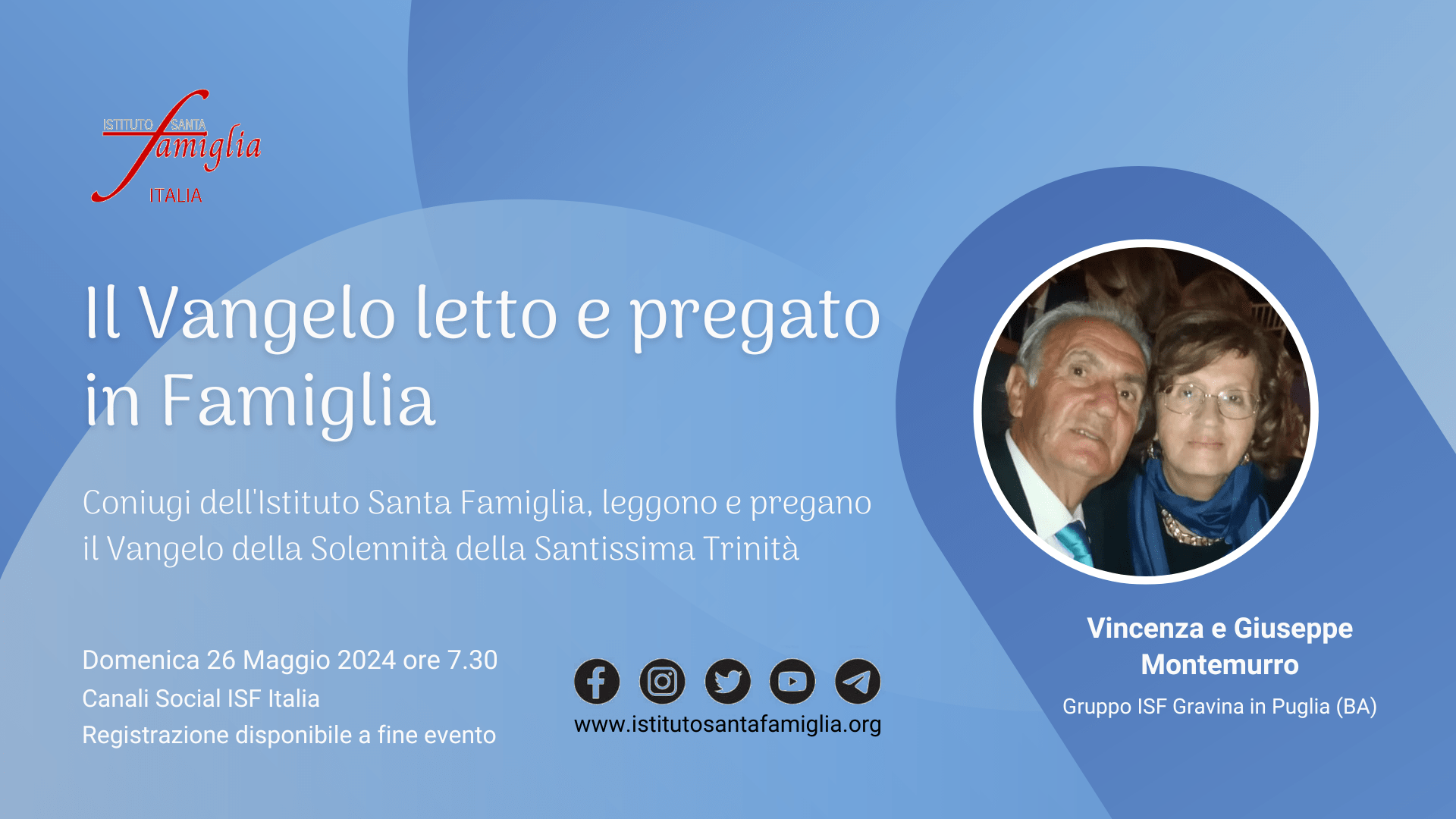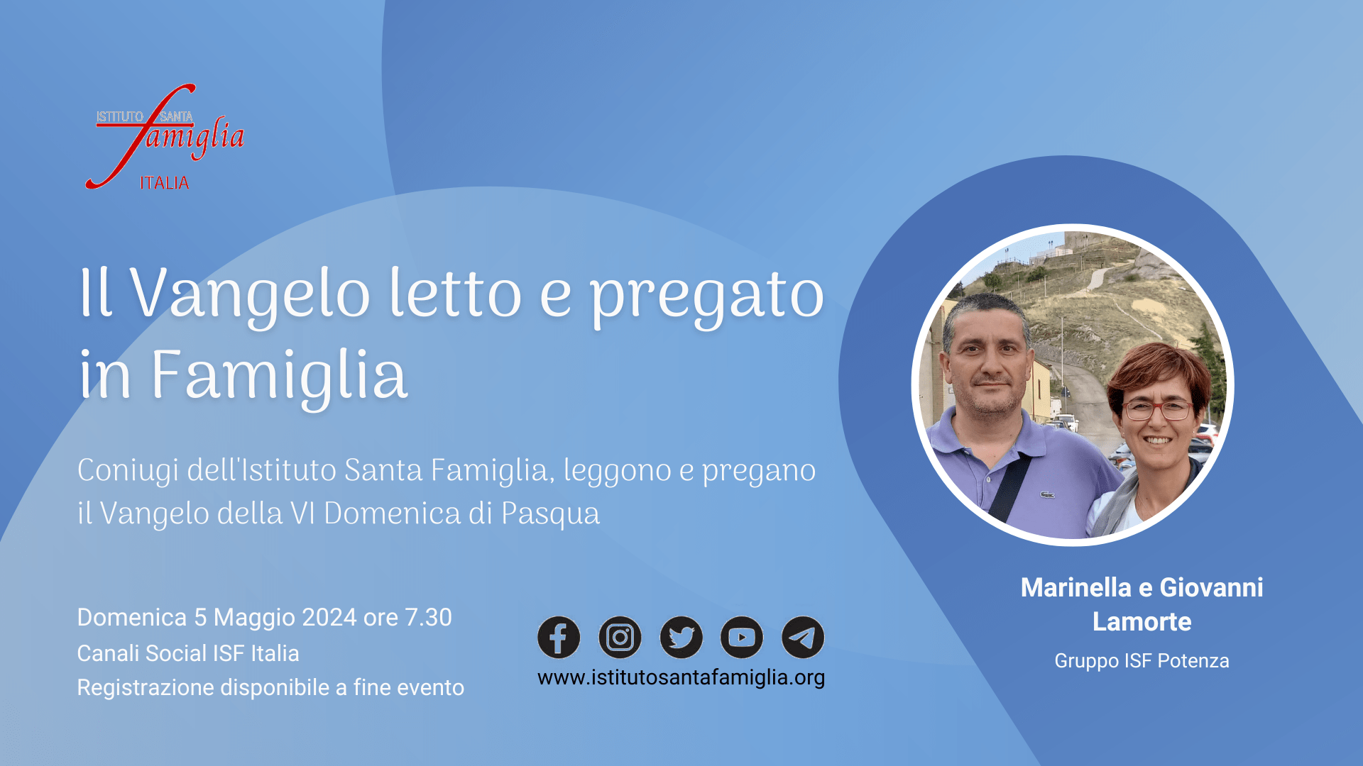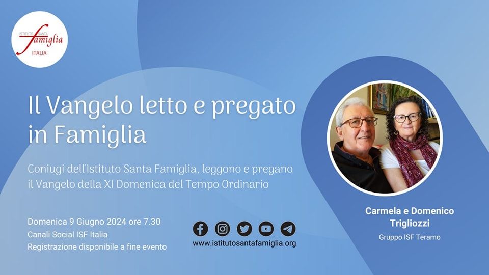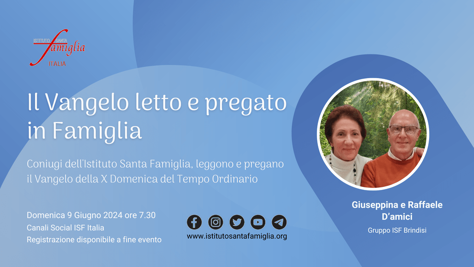 Istituto Santa Famiglia Italia è lieto di invitarti a Il Vangelo letto e pregato in Famiglia Domenica 16 Giugno 2024, alle ore 07.30, Carmela e Domenico Trigliozzi del Gruppo ISF Teramo, saranno con noi sui Canali Social dell’Istituto Santa Famiglia…