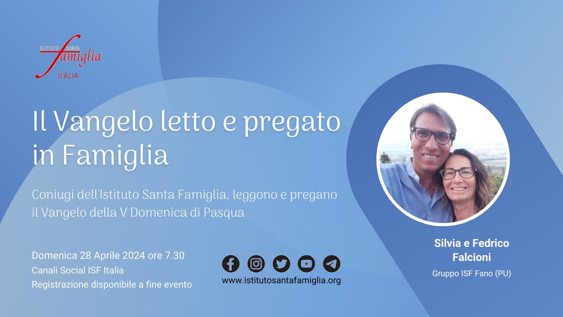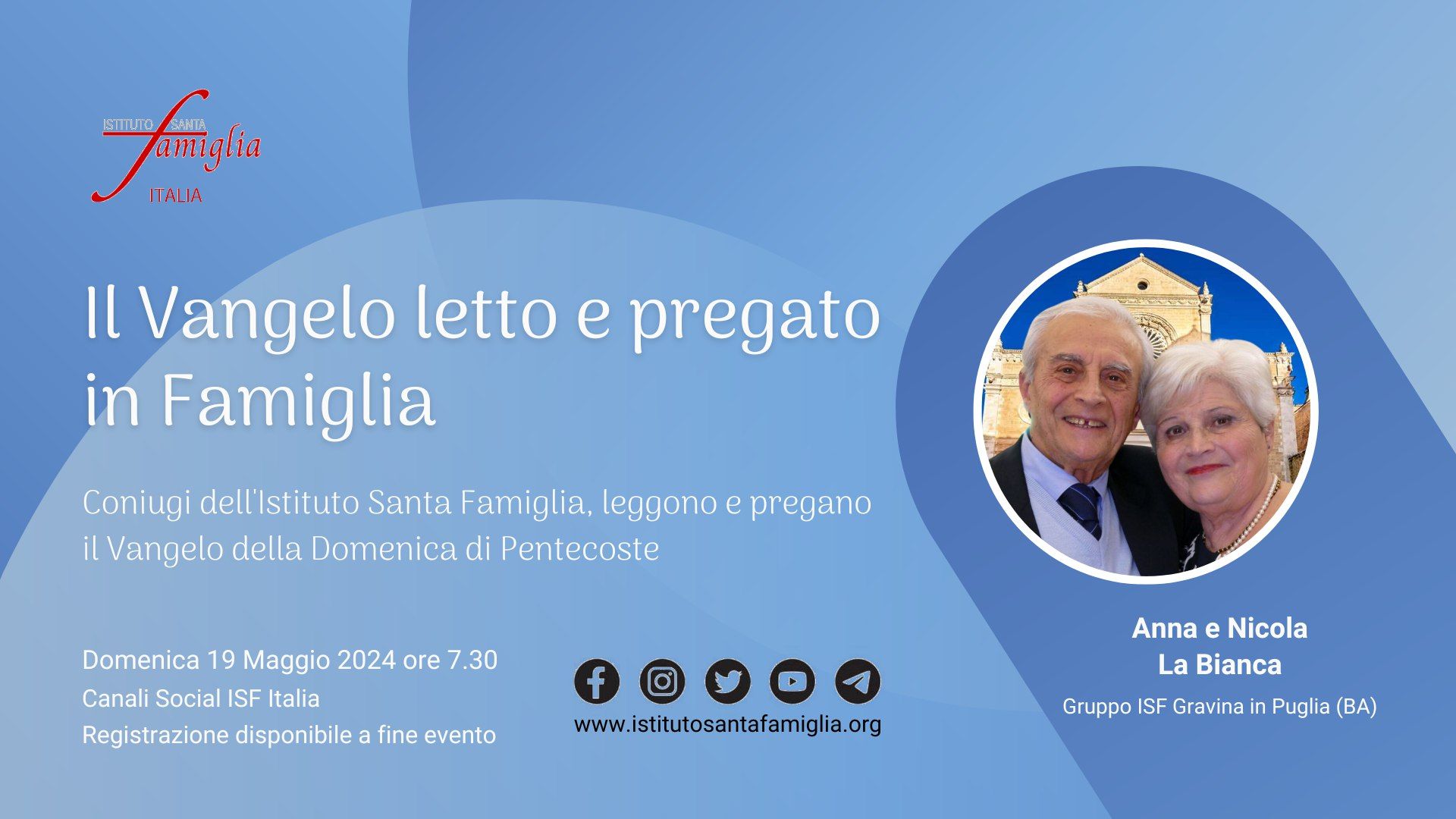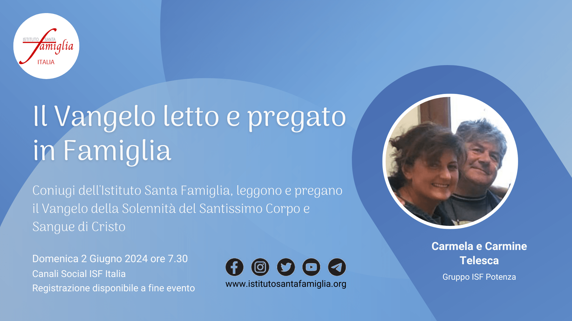 Istituto Santa Famiglia Italia è lieto di invitarti a Il Vangelo letto e pregato in Famiglia Domenica 16 Giugno 2024, alle ore 07.30, Carmela e Domenico Trigliozzi del Gruppo ISF Teramo, saranno con noi sui Canali Social dell’Istituto Santa Famiglia…
