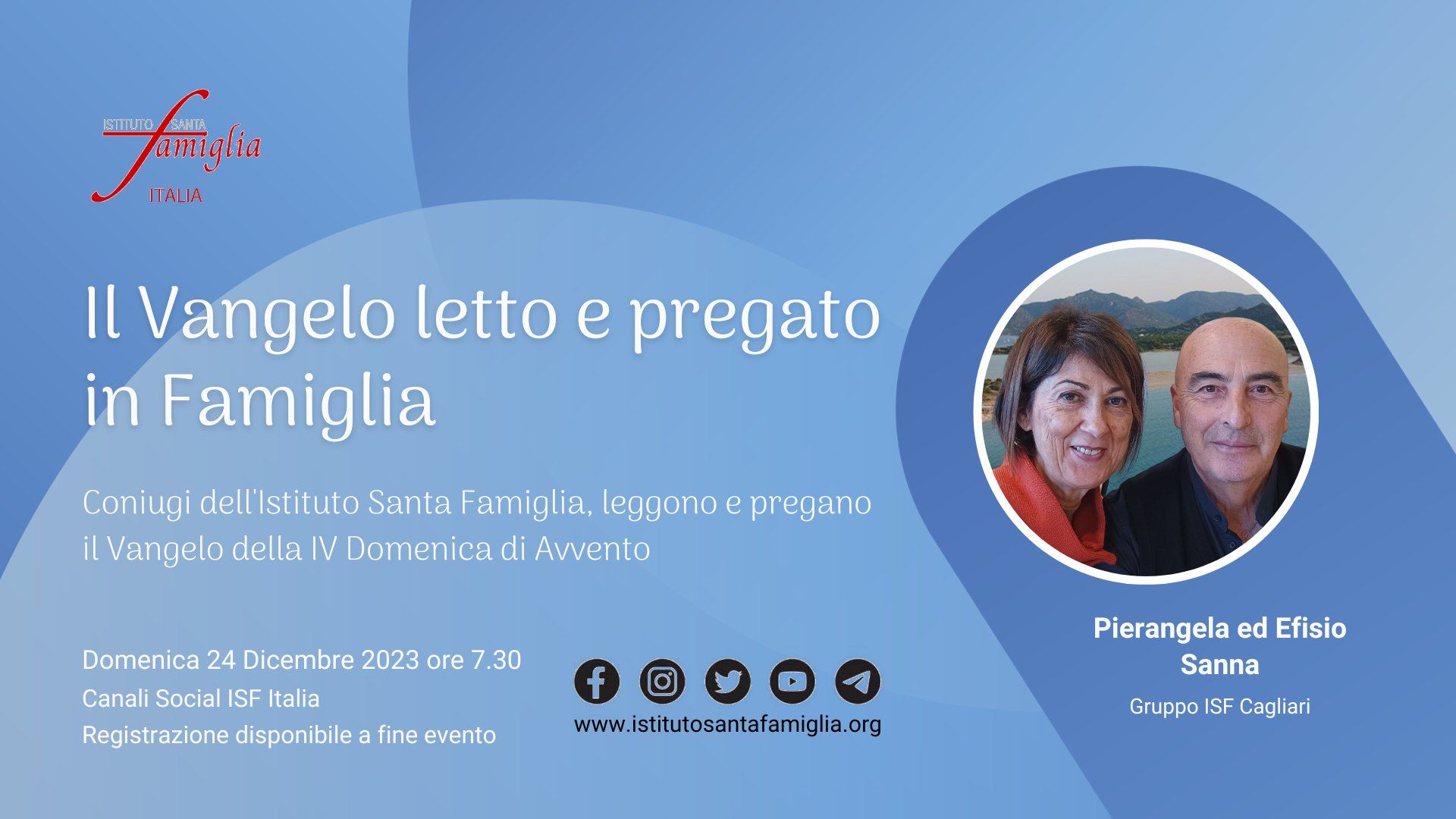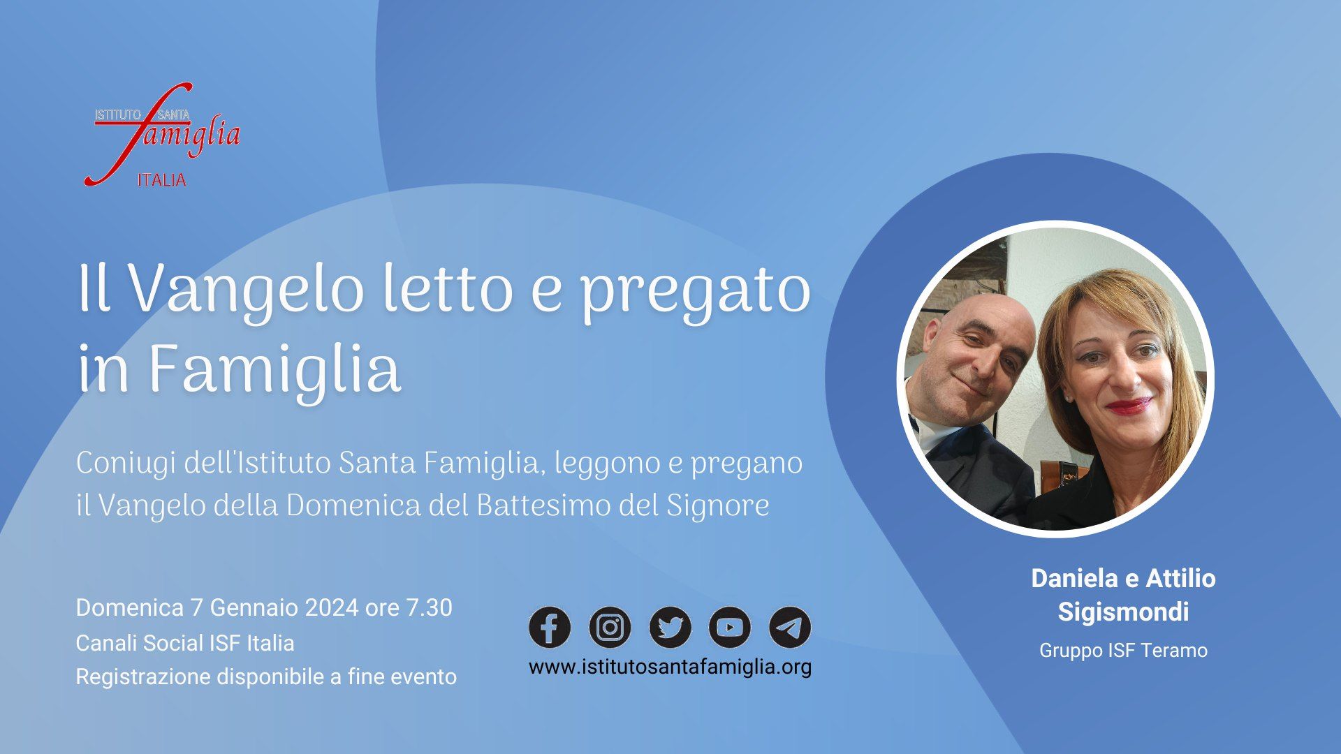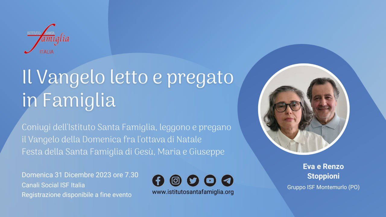Istituto Santa Famiglia Italia è lieto di invitarti a: Il Rosario della Famiglia OGGI, Domenica 7 Gennaio 2024, alle ore 21.00, in diretta sui Canali Social dell'Istituto Santa Famiglia Italia (Facebook, Twitter, YouTube). Link YouTube https://www.youtube.com/live/o-CSTIDz0LE Invitiamo a partecipare e…