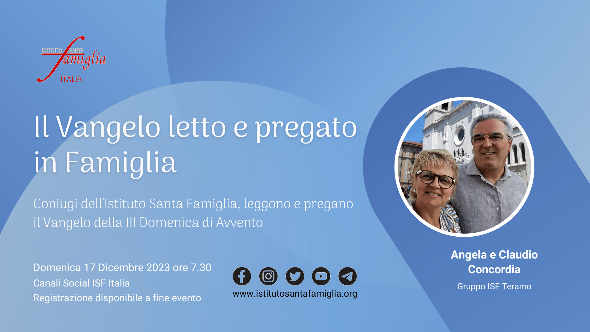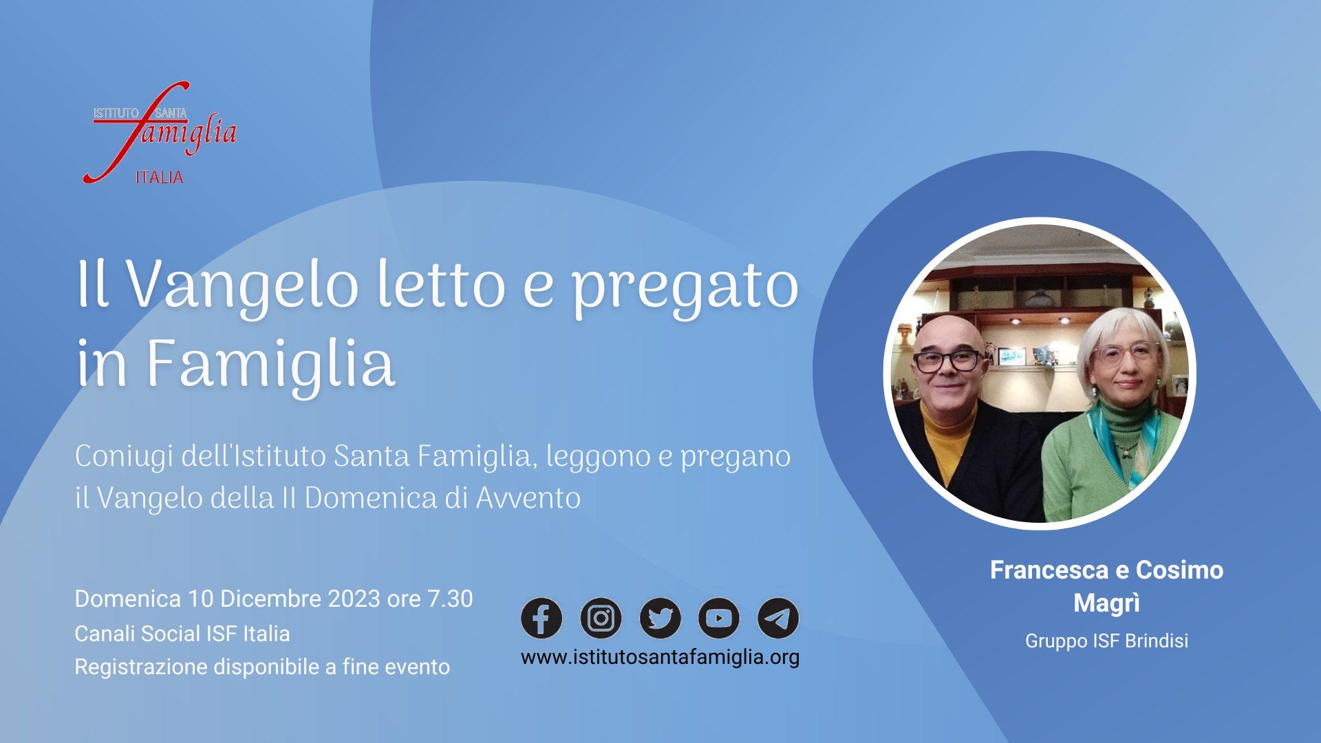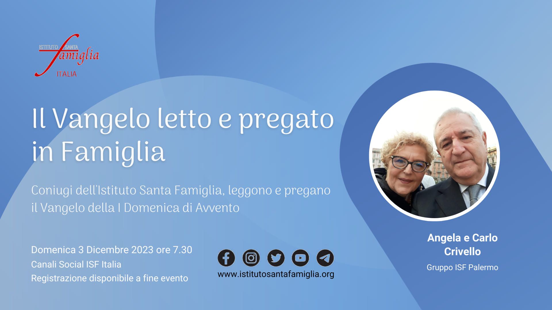 Istituto Santa Famiglia Italia è lieto di invitarti a: Il Rosario della Famiglia OGGI, Domenica 7 Gennaio 2024, alle ore 21.00, in diretta sui Canali Social dell'Istituto Santa Famiglia Italia (Facebook, Twitter, YouTube). Link YouTube https://www.youtube.com/live/o-CSTIDz0LE Invitiamo a partecipare e…