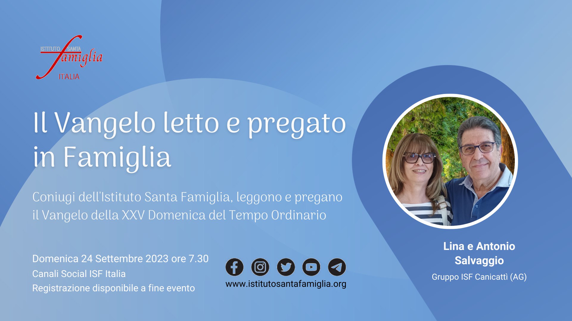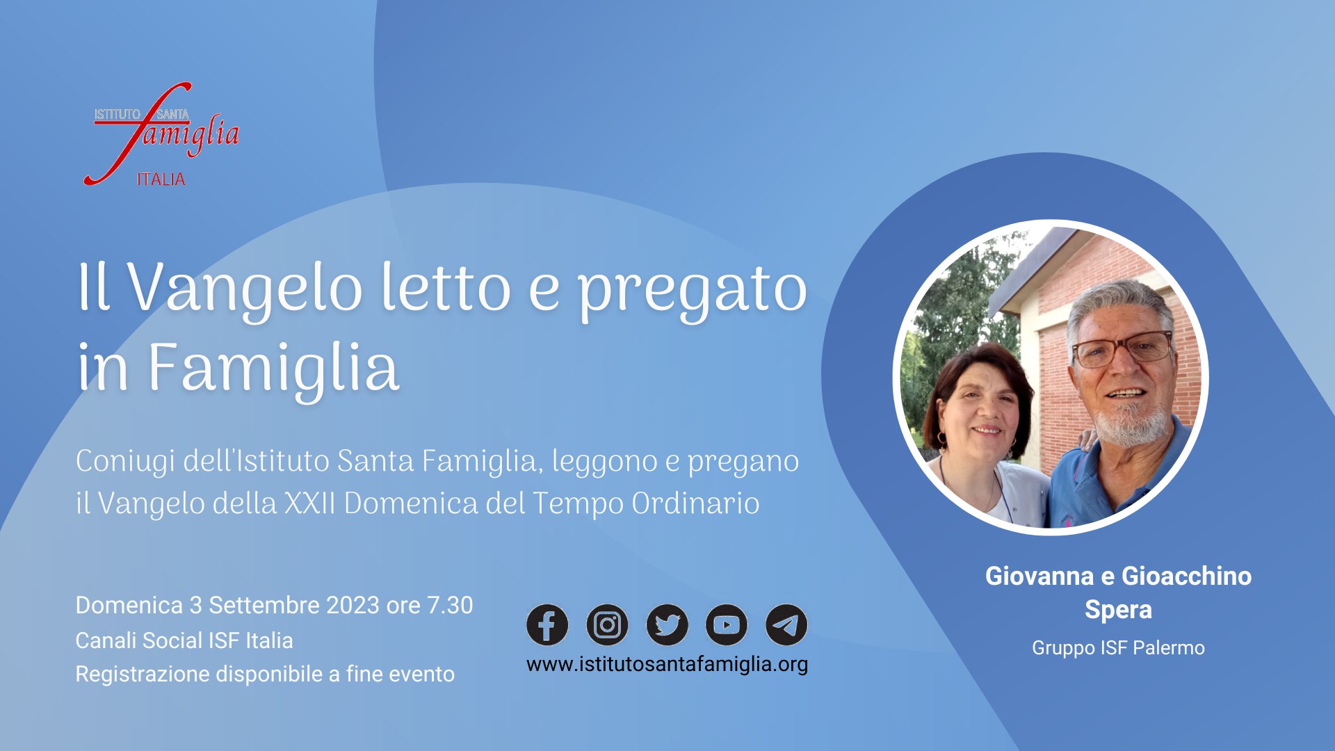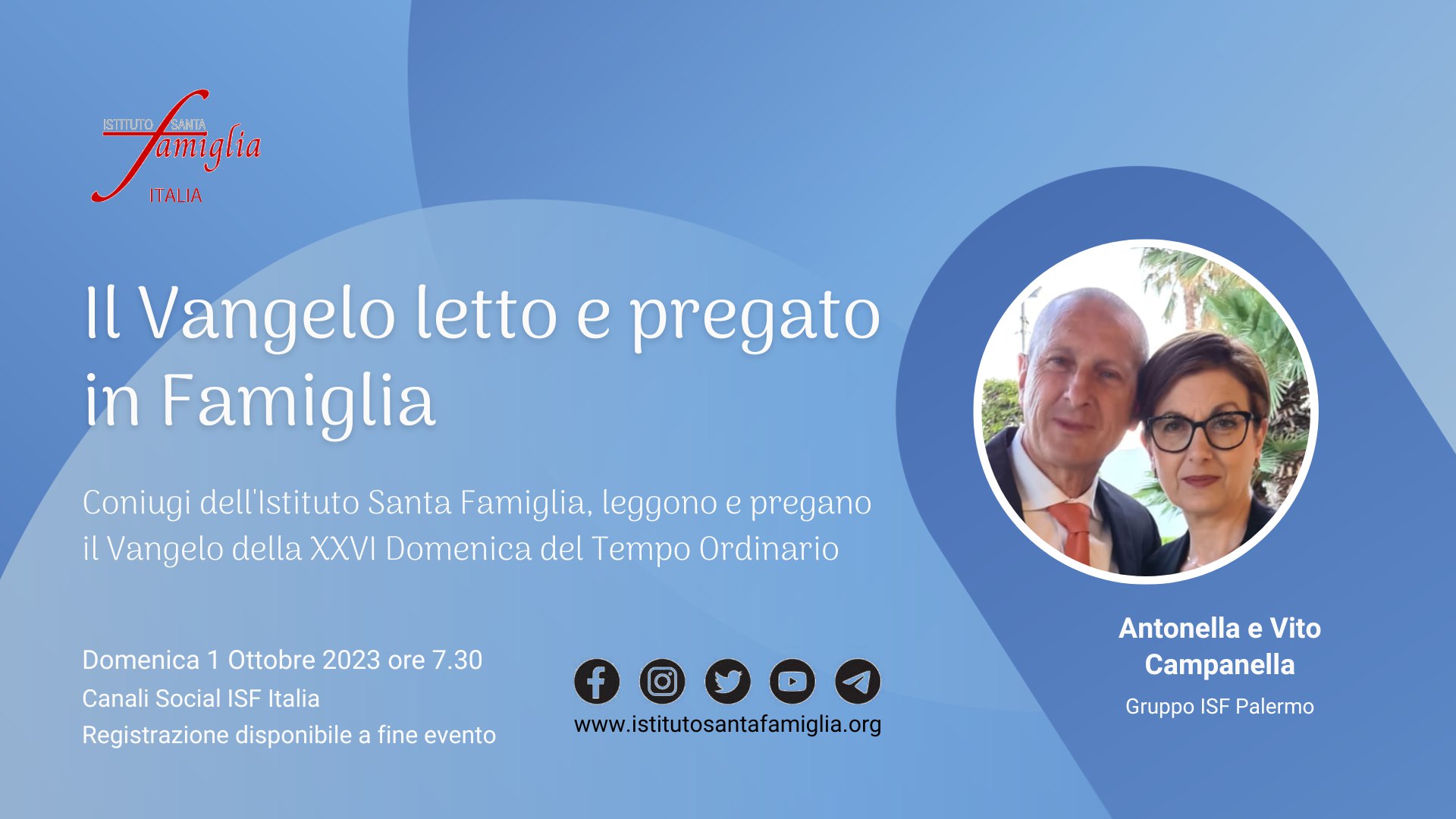 Istituto Santa Famiglia Italia è lieto di invitarti a: Il Vangelo letto e pregato in Famiglia Domenica 1 Ottobre 2023, alle ore 07.30, Antonella e Vito Campanella del Gruppo ISF Palermo, saranno con noi sui Canali Social dell'Istituto Santa Famiglia…