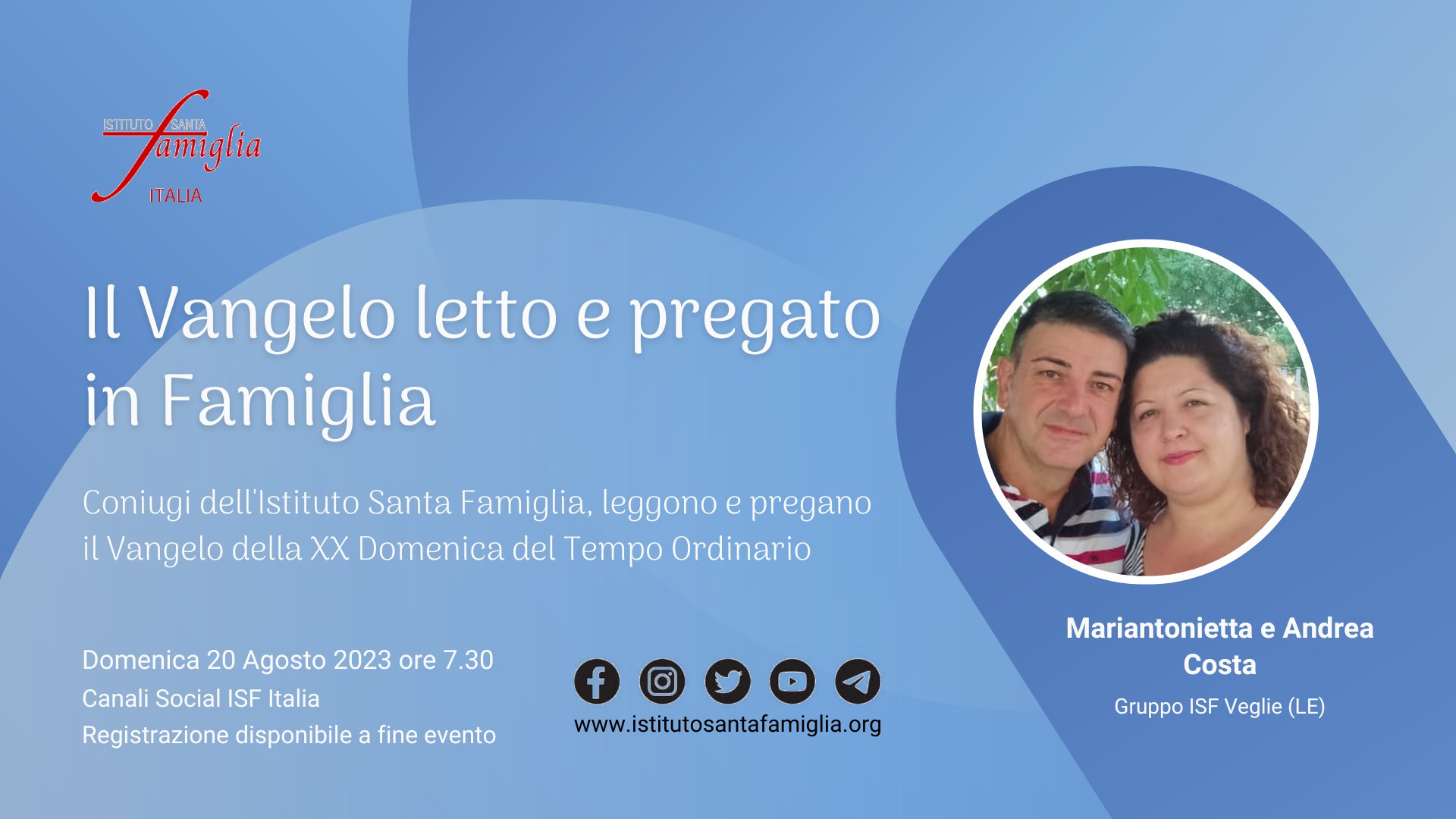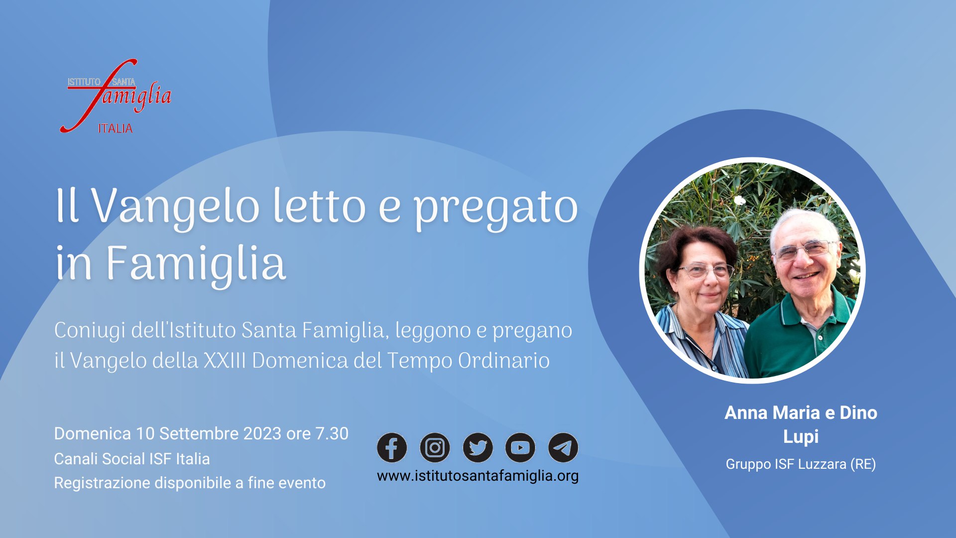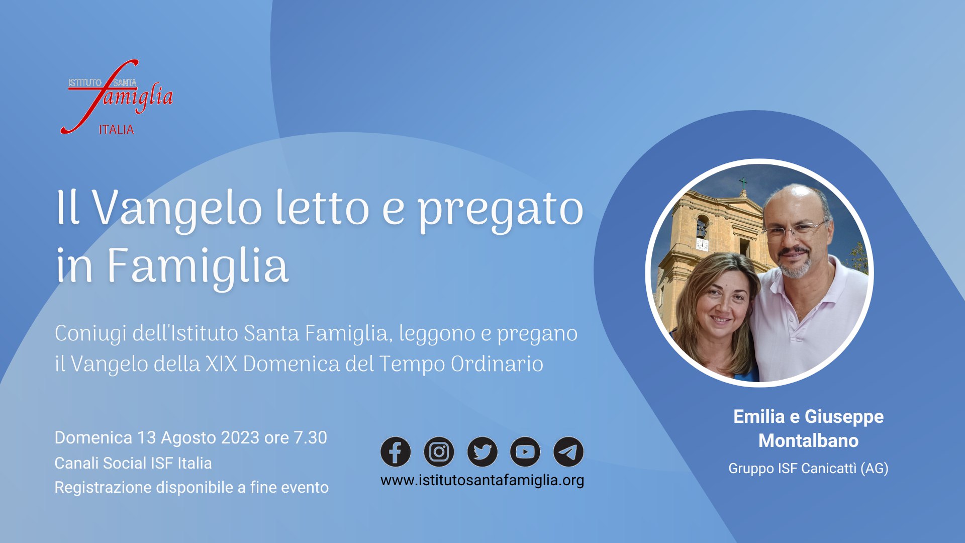 Istituto Santa Famiglia Italia è lieto di invitarti a: Il Vangelo letto e pregato in Famiglia Domenica 1 Ottobre 2023, alle ore 07.30, Antonella e Vito Campanella del Gruppo ISF Palermo, saranno con noi sui Canali Social dell'Istituto Santa Famiglia…