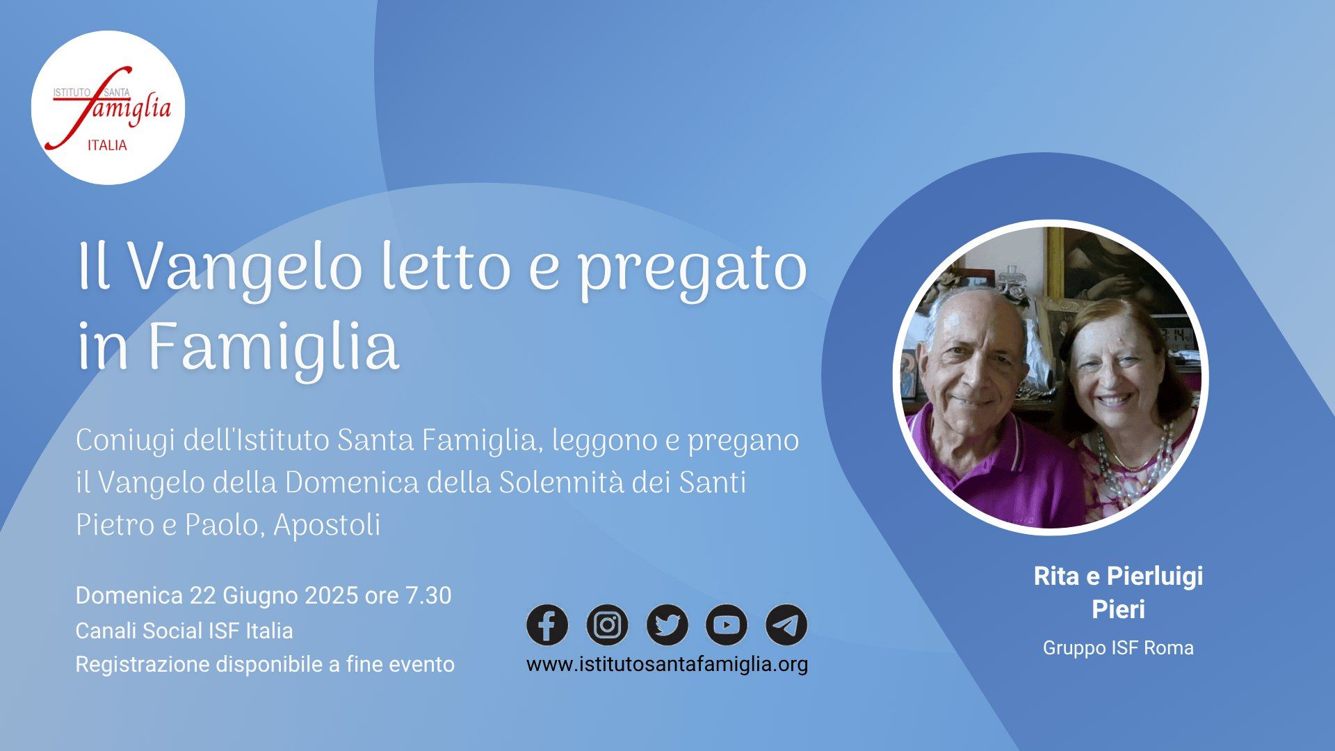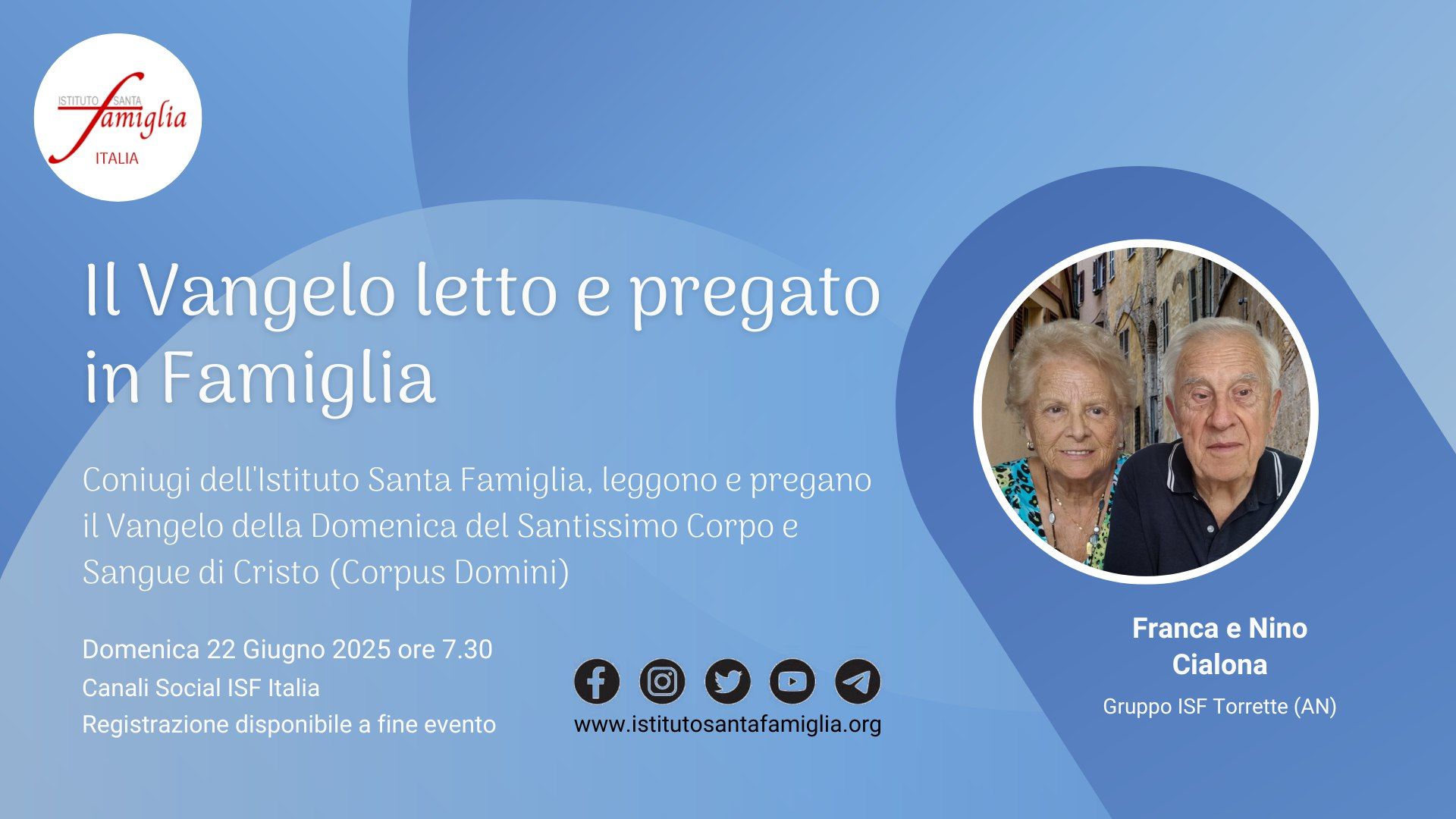 Istituto Santa Famiglia Italia è lieto di invitarti a Il Vangelo letto e pregato in Famiglia Domenica 10 Agosto 2025, alle ore 07.30, Rosy e Armando Picone del Gruppo ISF Corleone (PA), saranno con noi sui Canali Social dell’Istituto Santa…