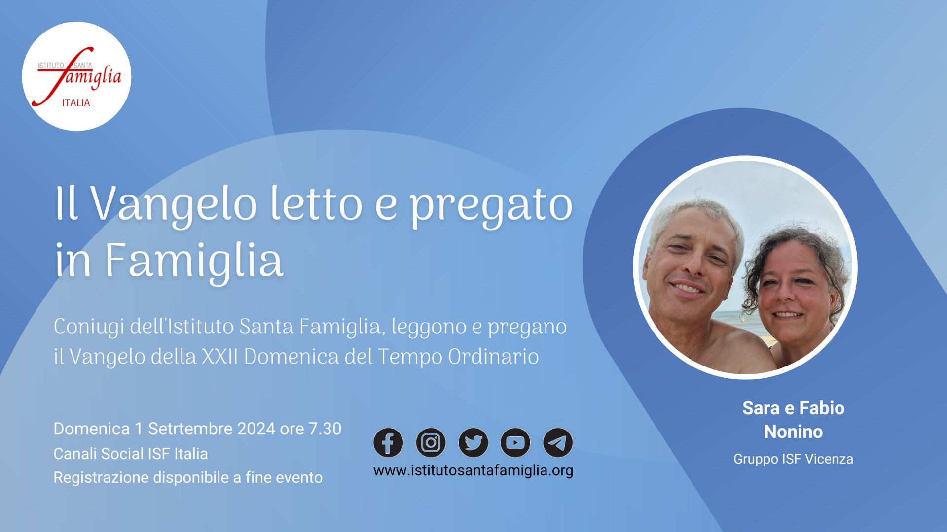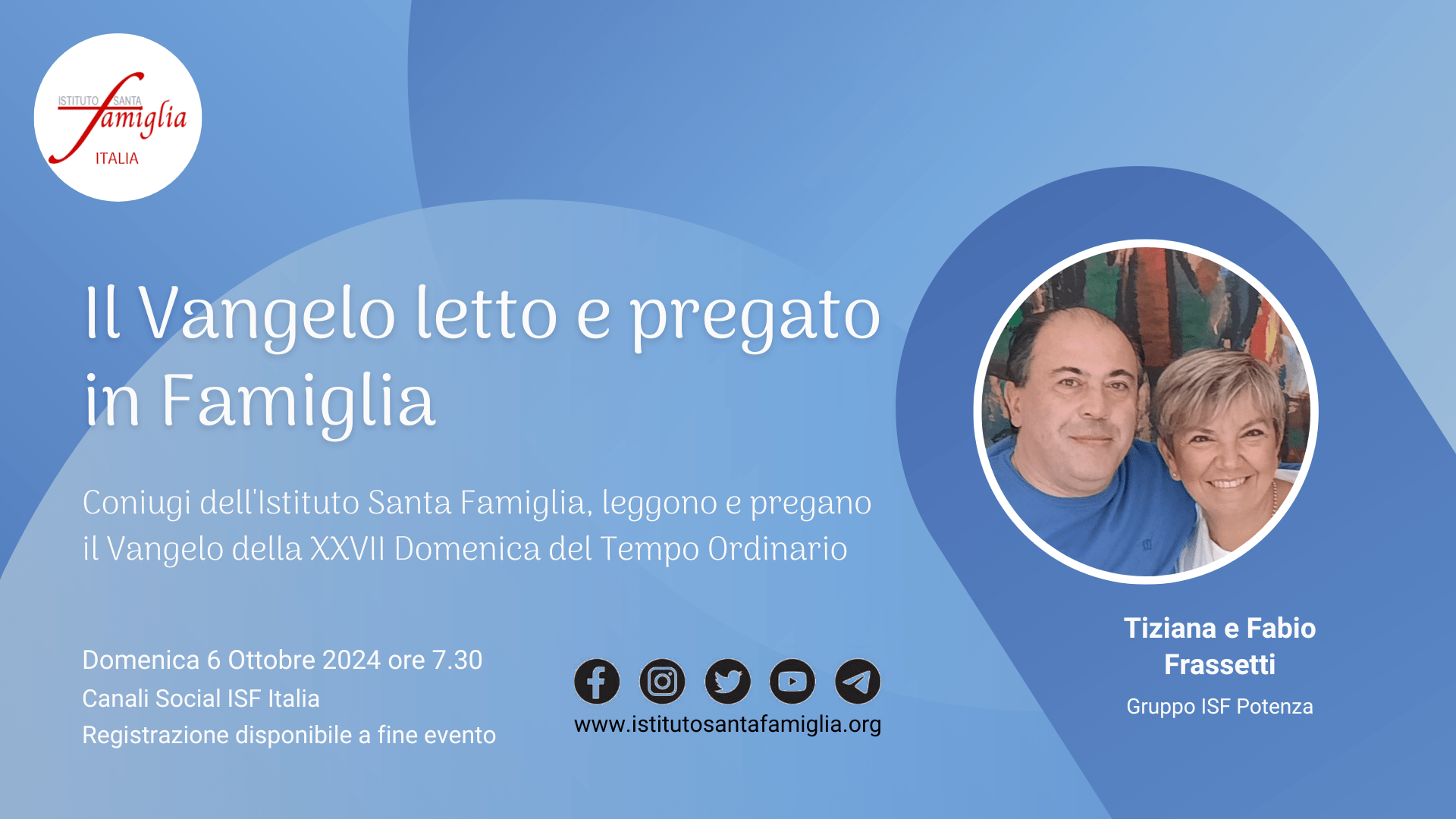 Istituto Santa Famiglia Italia è lieto di invitarti a Il Vangelo letto e pregato in Famiglia Domenica 6 Ottobre 2024, alle ore 07.30, Tiziana e Fabio Frassetti del Gruppo ISF Poteenza, saranno con noi sui Canali Social dell’Istituto Santa Famiglia…
