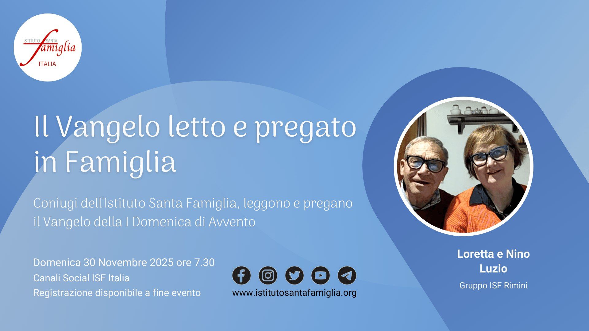 Istituto Santa Famiglia Italia è lieto di invitarti a Il Vangelo letto e pregato in Famiglia Domenica 9 Novembre 2025, alle ore 07.30, Rosaria e Angelo Grillo del Gruppo ISF Termoli (CB), saranno con noi sui Canali Social dell'Istituto Santa…
