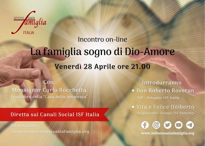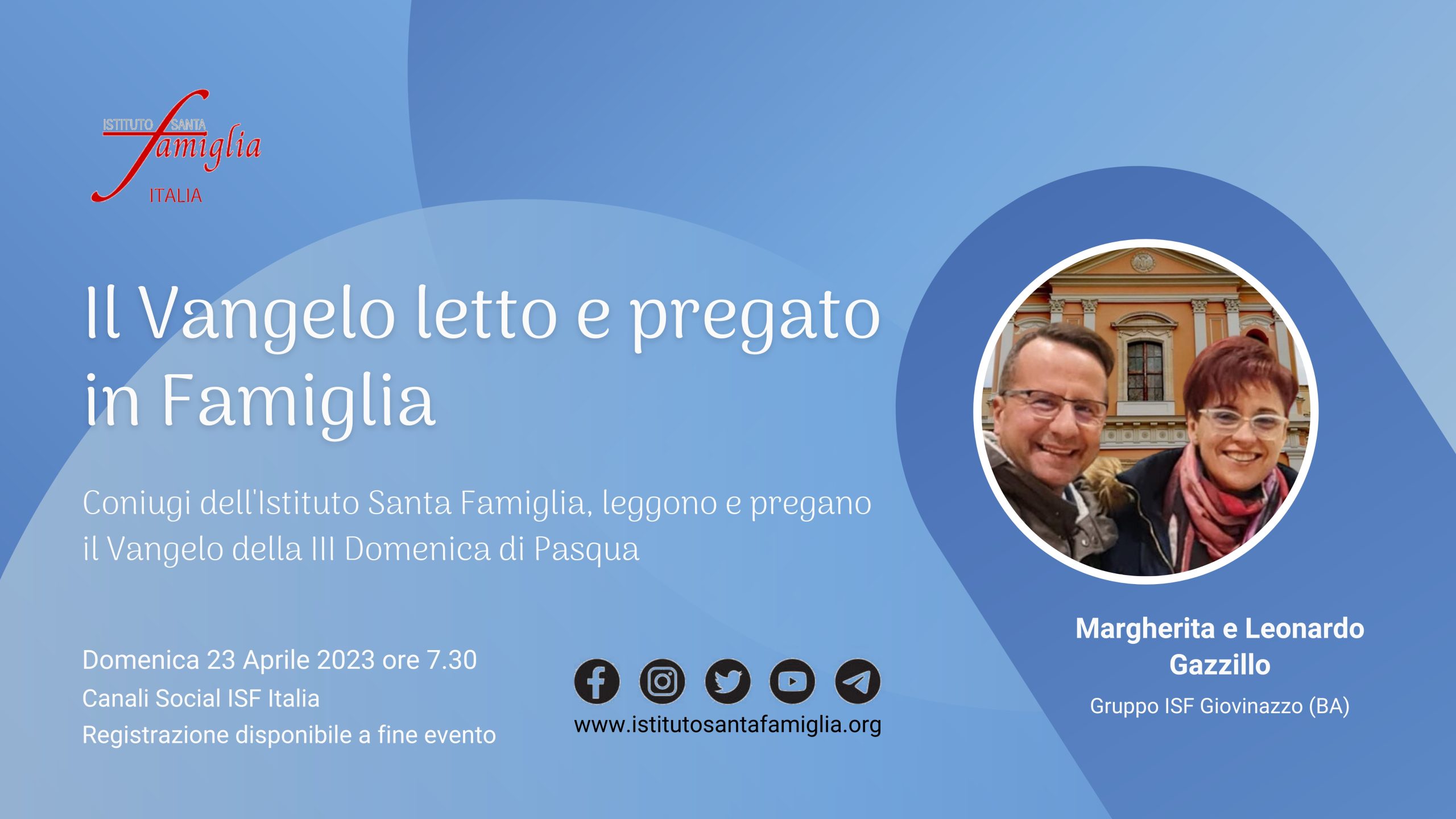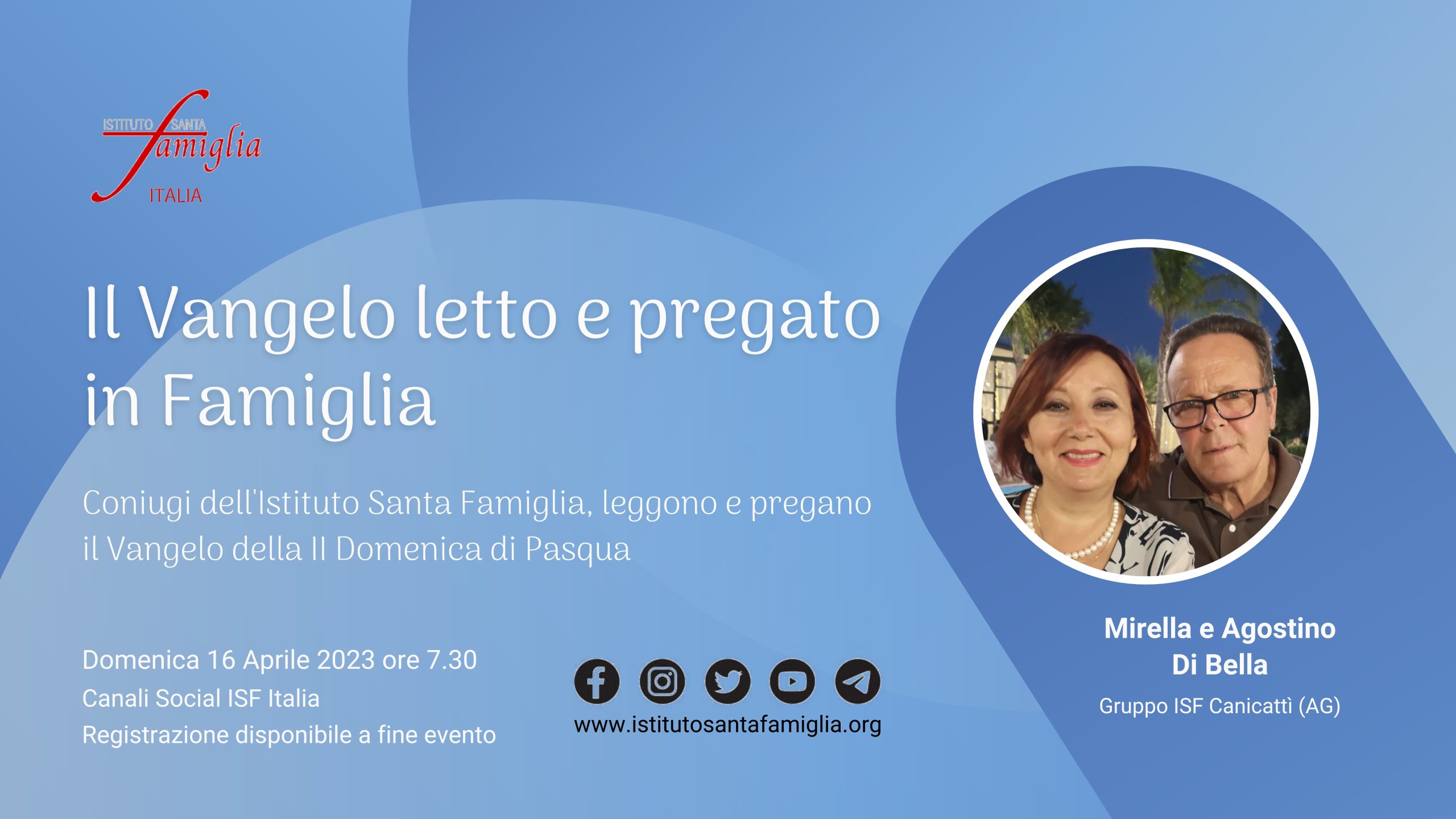 Istituto Santa Famiglia Italia è lieto di invitarti a: Il Vangelo letto e pregato in Famiglia Domenica 14 Maggio 2023 alle ore 07.30 Maria Carla ed Enzo Rebiscini del Gruppo ISF Città di Castello (PG), saranno con noi sui Canali…